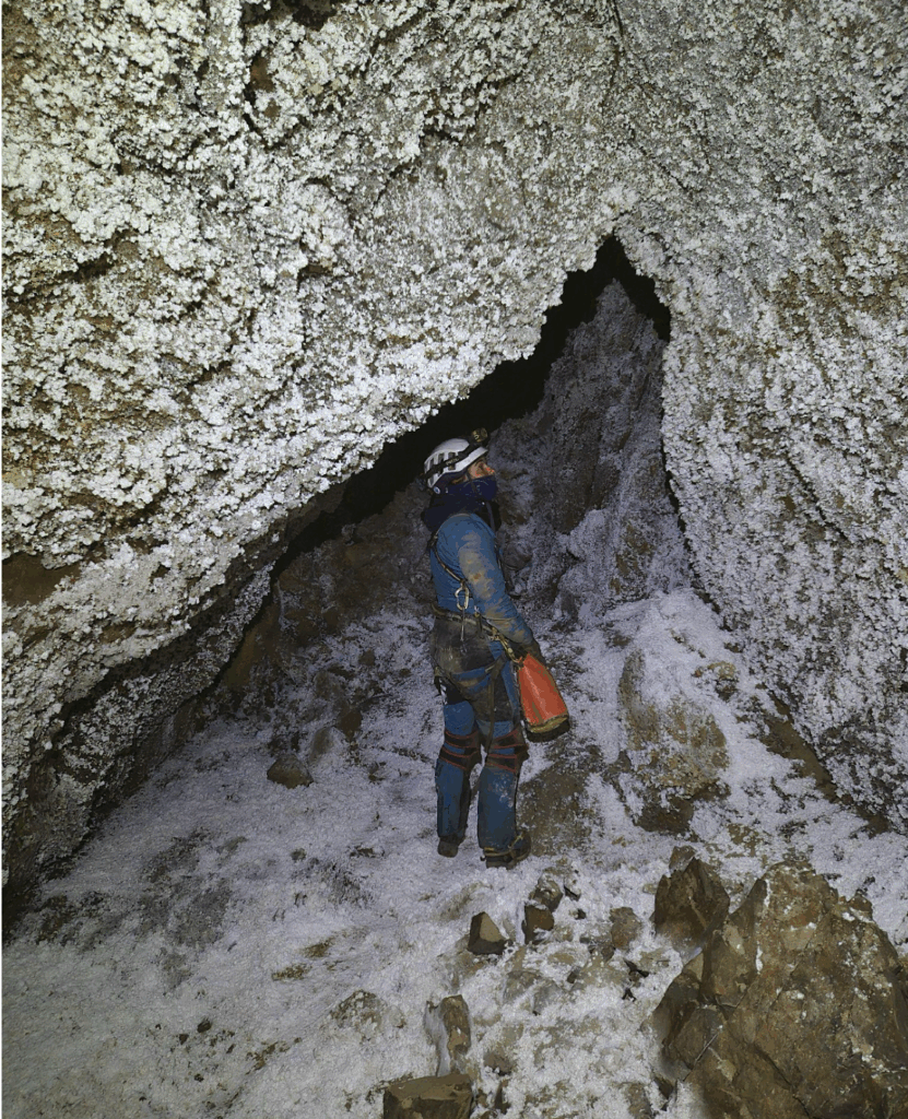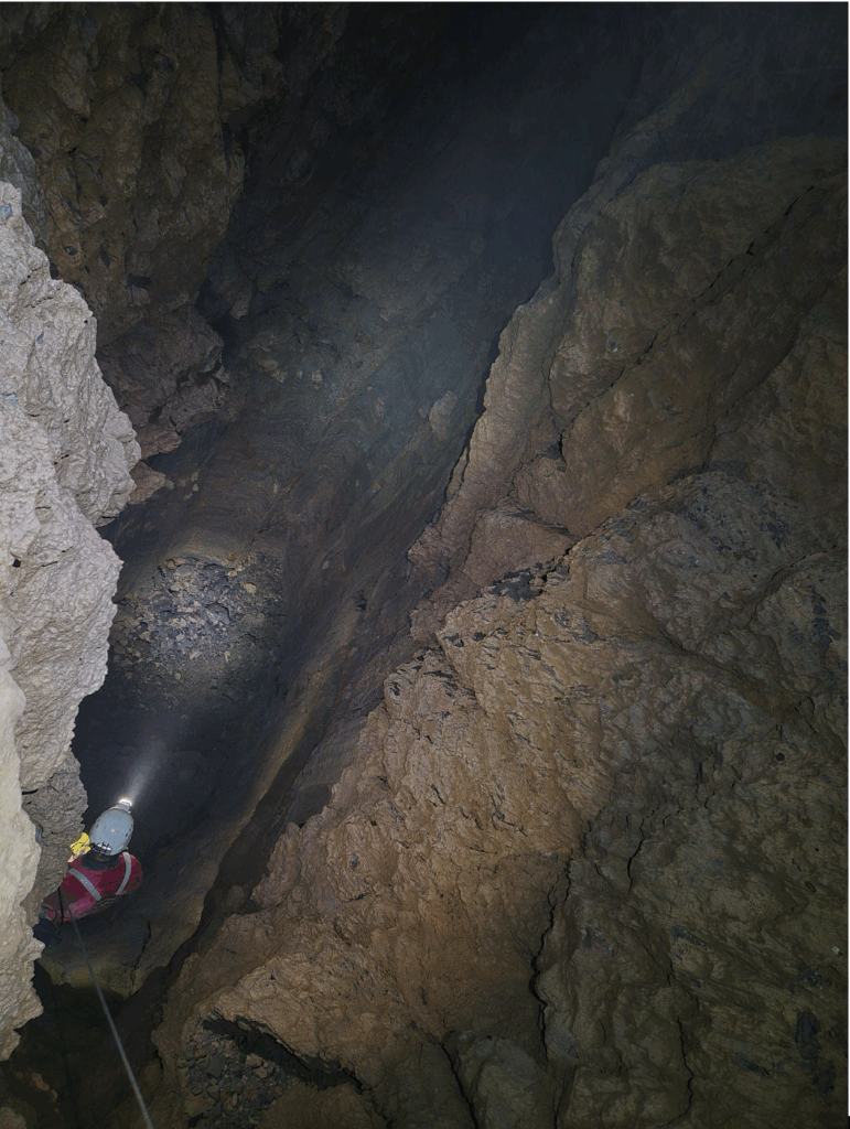 En 2024, le P395 qui suit a abouti à un arrêt sur trémie, à -839m. C’est le record de profondeur pour notre zone de prospection. En remontant, l’équipe avait repéré une grosse lucarne vers -620m avec un fort courant d’air ; c’était un objectif possible pour cette année.