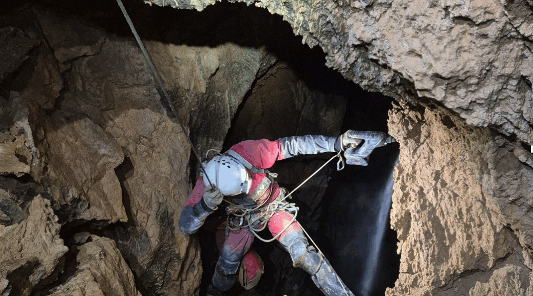 On débouche sur une zone d’effondrement, et entre les blocs on recroise un affluent qui débouche sur un P20 et P10 dans un actif. De là, part un méandre type vauclusien sans courant d’air et le terminus est un P10 qui semble finir sur pincement. Pour le moment, il n’y a pas de suite évidente, mais un gros travail de topographie a été nécessaire. Il reste des recherches en suspens pour 2026 y compris la lucarne qui nous attend sagement.