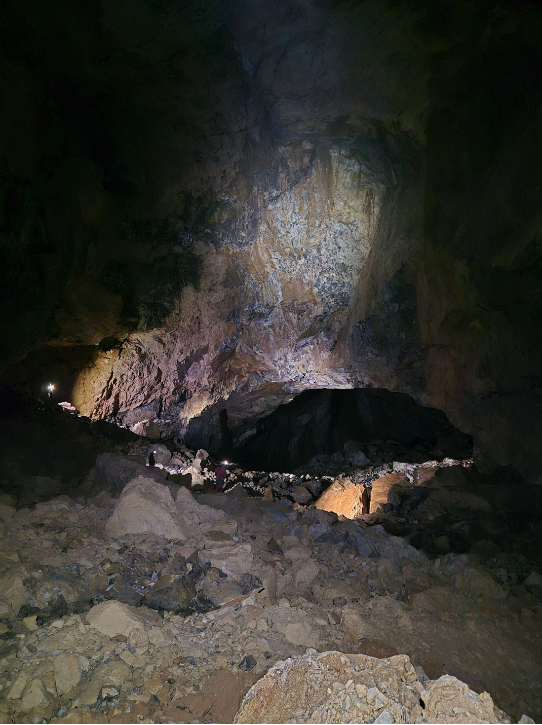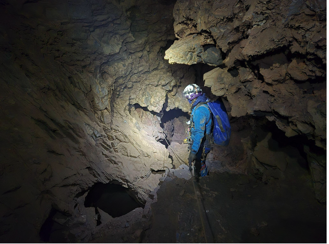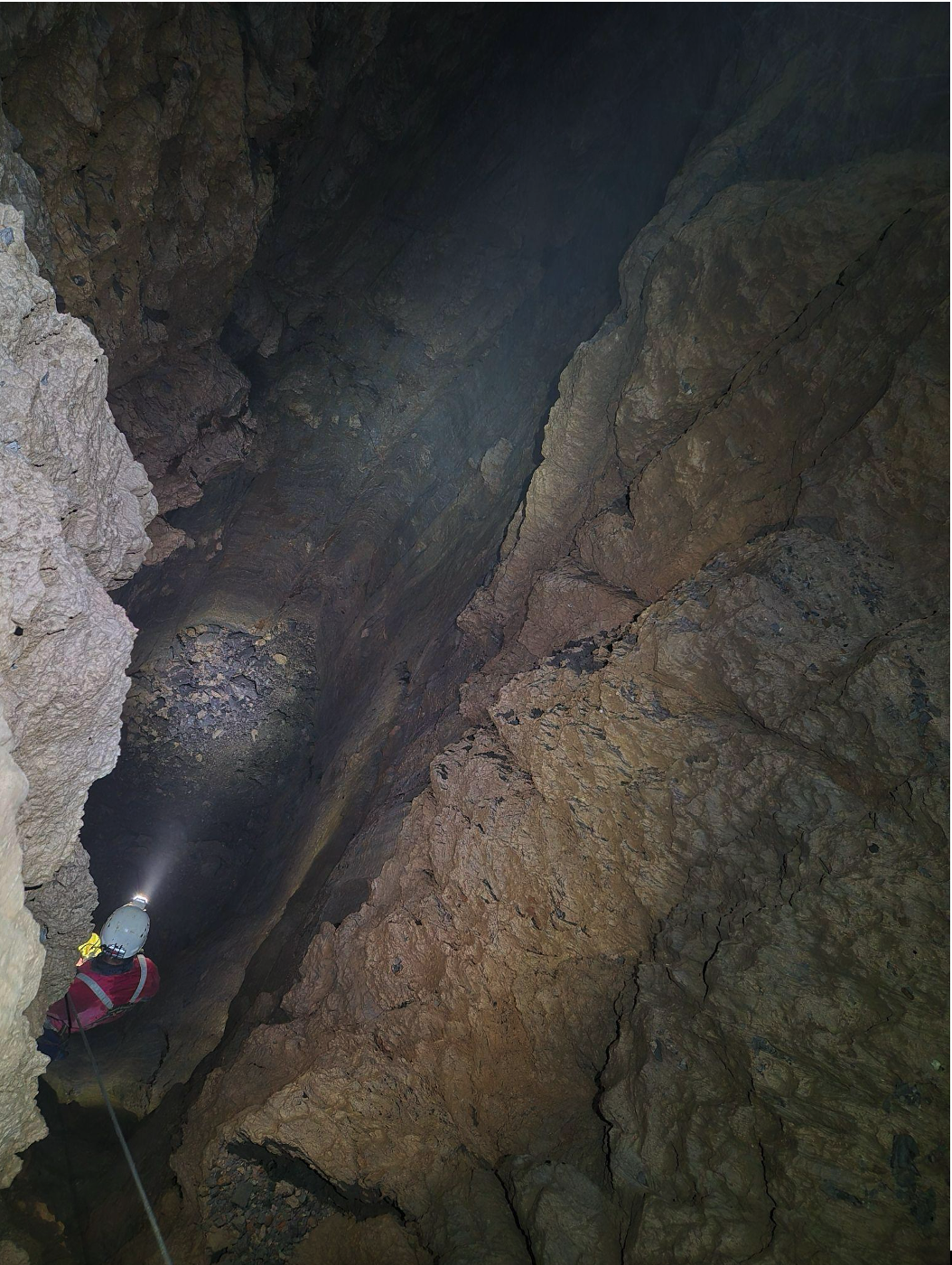 Une succession de puits avait permis de descendre à -300m en 2022, puis d’atteindre la profondeur de -425m en 2023, à la tête d’un puits énorme, évalué à 300m au lancer de caillou. Mais vu les deux heures de portage depuis le campement jusqu’à l’entrée du HS4, et les efforts importants pour progresser dans cette cavité entre 1° et 2°C, l’installation d’un bivouac est indispensable. La salle du Menhir, à -395m, accueille un barnum et des hamacs depuis l’an dernier. En 2024, le P395 qui suit a abouti à un arrêt sur trémie, à -839m. C’est le record de profondeur pour notre zone de prospection. En remontant, l’équipe avait repéré une grosse lucarne vers -620m avec un fort courant d’air ; c’était un objectif possible pour cette année. La première équipe de pointe refait la topographie du fond du puits car un doute subsiste : le P375 est en réalité un P395 ! Cette fois-ci pas de brouillard dans le fond du grand puits et une grosse lucarne est repérée lors de la topo à 80 mètres du fond. Une galerie est découverte, qui débouche sur une énorme salle de 220m sur 80m ; haute par endroits de plus de 100m. Sur un des côtés de la salle, une conduite forcée remplie d’aragonite est découverte, un fort courant d’air aspirant est présent.